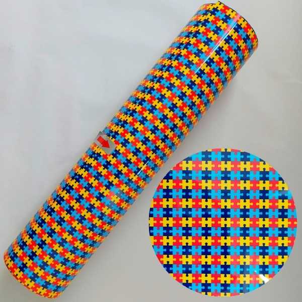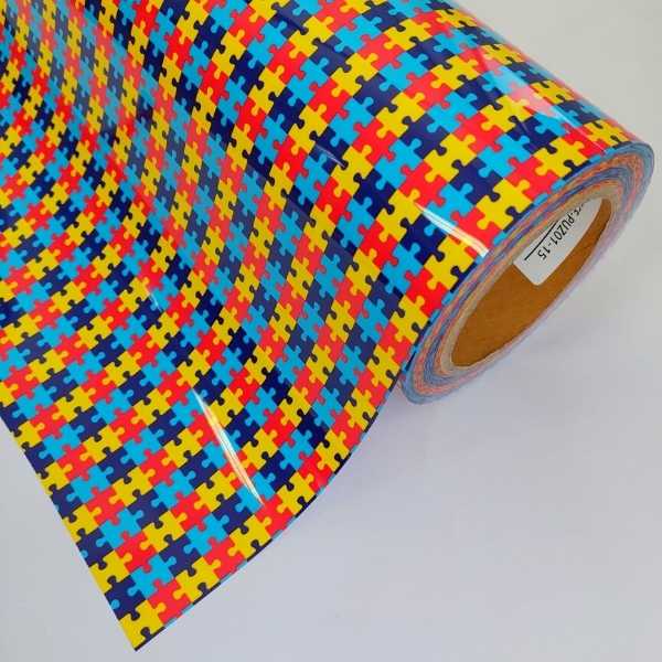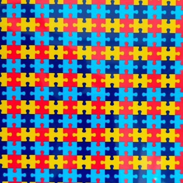 O filme de recorte com o desenho de quebra-cabeças tem sido muito utilizado na estamparia para a conscientização do autismo e educação da sociedade em relação ao autismo.