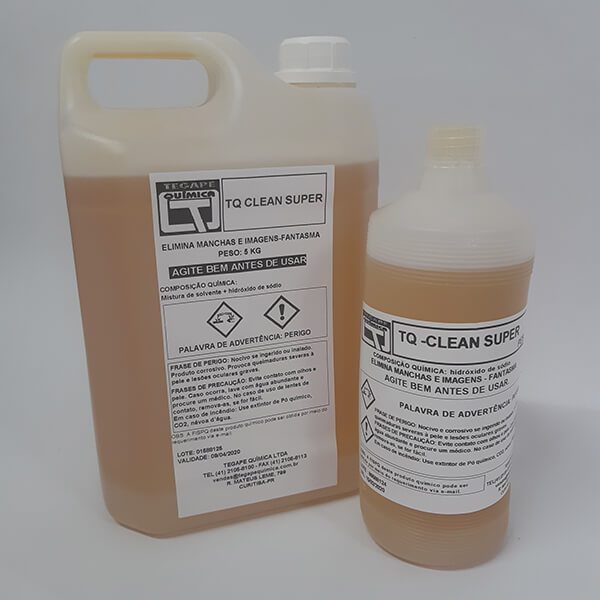 O TQ Clean Super é um removedor de fantasmas sob a forma de gel alcalino, especialmente ativo e solúvel em água, que elimina restos persistentes de emulsões e tintas, bem como imagens fantasmas residuais. Age sozinho e pode ser usado também para recuperar telas catalisadas. Funciona ainda como desengraxante, é isento de cloro e de outros agentes agressivos. Disponíveis em embalagens de 1 litro e 5 litros.